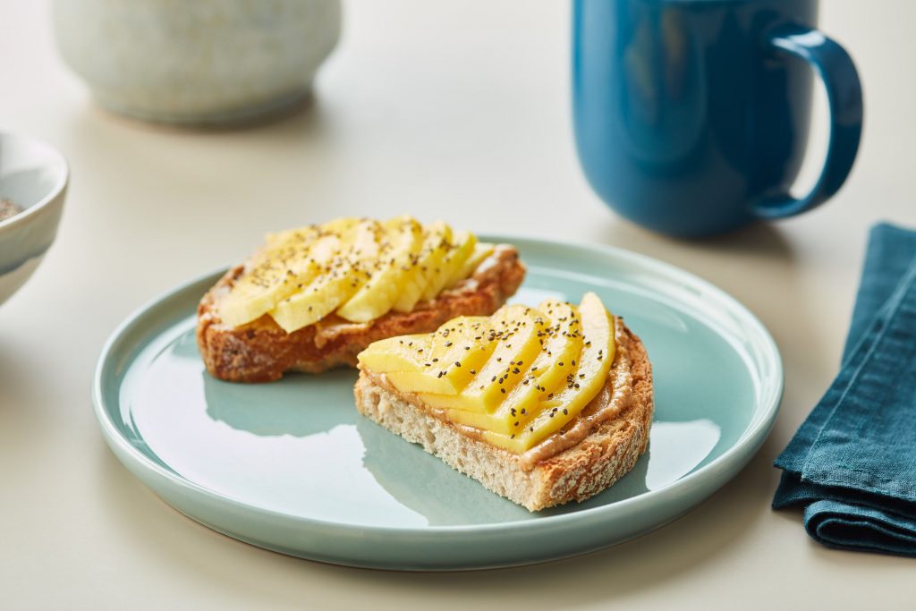 2) Toast the bread slices, spread the hazelnut butter and top with mango slices and chia seeds.