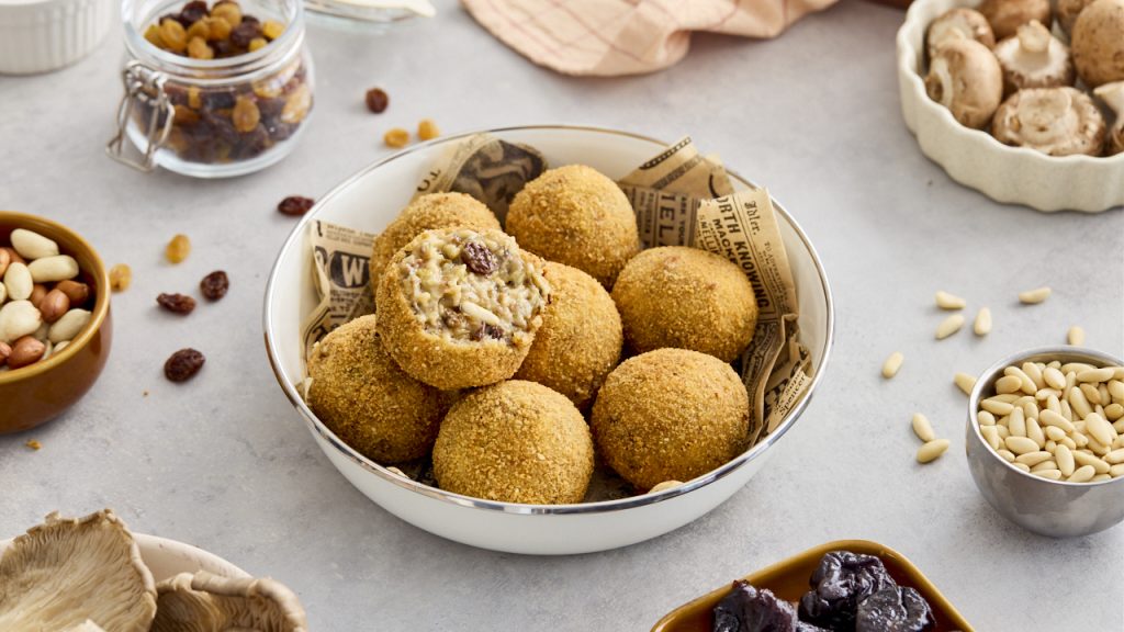 An innovative twist on traditional Dutch croquettes, with a creamy filling of mushrooms, nuts, and spices.🍄Coating them in peanut flour and adding raisins, pine nuts, and prunes creates deep flavors and a contrast of textures.